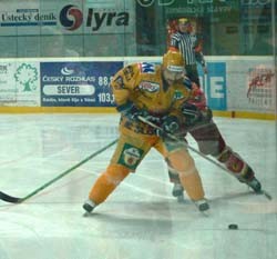 Ve 30. minutě nahodil Sýkora kotouč ze středního pásma do pravého rohu kluziště,