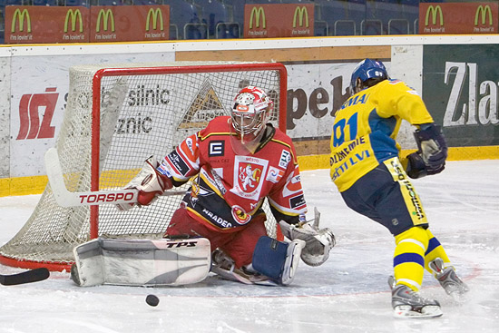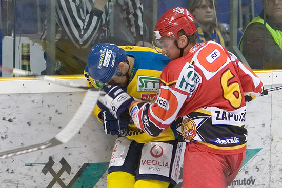 Branky a nahrávky: 38. Mikulík (Sklenička, Němeček), 49. V. Novák (Pojkar, Janků) - 9. Fořt (Kadlec), 25. Koudelka (Kadlec, Hendrich), 27. Fořt (Roubík). Rozhodčí: Zubzanda, Šindler - Rozlílek, Sichrovský. Vyloučení: 4:9. Využití 1:0. Diváci: 4825. Střely na branku: 53:18 (16:8, 17:7, 20:2). Průběh utkání: 0:3, 2:3.