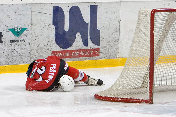 Po novém promíchání ústeckých útoků zaměstnala první formace Havířovské v jejich obraně, Alinč přejel modrou a šikovně nechal puk za sebou, odkud se ho nerozpakoval na bránu poslat Šaffer, jeho střela nebyla shledána nebezpečnou, Vošvrda puk za svá záda nepustil. Zajímavější to mohlo být vzápětí na druhé straně, Lvi totiž přišli v útoku o puk a pustili hosty do přečíslení. Fořt ovšem neprotlačil kotouč přes padajícího obránce, i když mu na druhé straně najížděl Moravec. Výsledkem byla alespoň přesilová hra, v níž mohl Pantery poslat do vedení Zeliska. To by se ale nesměl Orct bleskově přesunout k druhé tyči. Když na domácího brankáře nevyzrál ani Žajgla bekhendovým blafákem, převzali útočnou taktovku opět Lvi. Jenže před brankou Havířovských bylo až moc těsno, klid na zakončení neměl ani Pazourek ani Kloz. Hosté pro změnu hrozili z protiútoků a na rozdíl od domácích se vcelku bez problémů dostávali i k odraženým pukům. Ke konci třetiny to přece jen začalo vypadat, že by domácí mohli přelstít obranu Panterů, povedlo se výborně uvolnit Pavla Janků na levém křídle, jenže zakončení nebylo stoprocentní. Mrázek se nečekaně dostal před dva obránce, se střelou se ale trochu ukvapil, nedal jí ani potřebnou výšku ani směr. Jako blesk z čistého nebe se ve dvacáté minutě vřítil Hovorka do útočného pásma a nekompromisní tvrdou ranou poslal domácí do vytouženého vedení – 1:0.