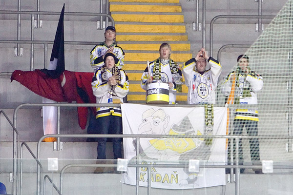 První výměny tohoto mače proběhly ve středním pásmu. Teprve Kloz s Alinčem se dostali do útoku, ovšem soupeř je nepustil dál než k mantinelu. Více štěstí měl Klobouček, kterému se při střídání otevřela cesta před Jarinu, kadaňský gólman si stihl proti jeho střele dobře vyjet. Nebezpečnější situace vznikla na opačné straně kluziště. Charousek se zbavil svého strážce, aby přihrál do volného prostoru mezi kruhy Gombárovi, ten mířil do protipohybu Salfického, domácí brankář přesto stihl puk vytěsnit betonem. Následovaly dvě vyloučení na straně Lvů, a tak si hosté neváhali vychutnat zamknutí favorita v jeho obraně. Útočnou snahu se jim nepodařilo korunovat brankou. Oproti tomu Ústí stačila necelá minuta přesilovky. Pojkar se napřáhl na modré a jeho střelu tečoval za Jarinova záda Pazourek. V další fázi hry přestalo zcela existovat střední pásmo. Oba týmy jím procházely jako nůž máslem. Nejprve zakončoval chytře své sólo Hanzl, jeho záměr prostrčit puk k bližší tyči ale Jarina prohlédl. Na druhé straně vypálil z levého křídla Balázs. A znovu se spěchalo ke druhé brance, volný Mikulík ovšem neobdržel přihrávku od R. Pšurného. Hrál se oboustranně rychlý a útočný hokej. Svou aktivitu Kadaň okořenila brankou v početní výhodě. Gombár vypálil z pozice pár kroků před modrou, Salfický puk vyrazil na hůl Charouskovi, který se neukvapil a místo střely puk prostrčil na Bouška u druhé tyče, ten nemohl netrefit branku zívající prázdnotou - 1:1. Na tempu hry se nic nezměnilo, puk neustále putoval napříč celým kluzištěm. Útočníci obou celků si ale lámali zuby o dobře rozestavěné obrany a pohotové gólmany, a tak už se skóre 1. třetiny nezměnilo.