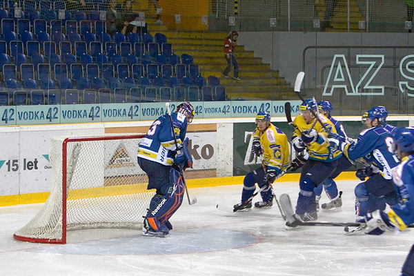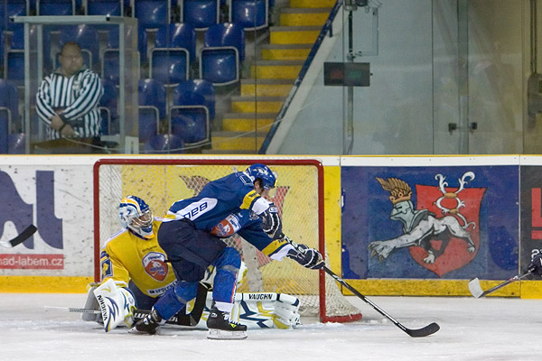 Posledního extraligového soupeře před ostrým startem 1. ligy přivítaly na ústeckém ledě poměrně prořídlé ochozy. Domácí začali aktivně a už ve 3. minutě vybojovali první přesilovou hru. I při ní hýřili aktivitou, do přímého ohrožení kladenské branky se ale nedostali. Hra se poté přelévala ze strany na stranu, oba brankáři byli ve střehu. V 6. minutě vystřelil pěkně Drtina a hosté poté Lvy sevřeli v obranném pásmu. Zhruba v polovině první třetiny si vzali slovo opět domácí a několika výpady nenechali hostující obranu vydechnout. První branka utkání padla ve 12. minutě. Až příliš mnoho prostoru za brankou dostal Látal, na jeho přihrávku mezi kruhy si sjel nikým neatakovaný Bílek a Orct byl bez šance - 0:1. Vzápětí se řítili na domácí branku hned dva hráči Kladna, ale Orct parádním zákrokem a Hořava malým háčkem celou situaci vyřešili. První přesilovku si tak zahráli i hosté, ale ani oni s ní nenaložili ku spokojenosti svého trenéra. V 15. minutě vypálil z pravého kruhu Kanko, jeho bomba však cíl mezi třemi tyčemi nenašla. Další nepříjemnou střelu zkrotil Cikánek vzápětí. V 18. minutě schoval střelu za hráče Mrázek, Orct byl pozorný. Vyrovnání si domácí hokejisté schovali na závěr úvodního dějství. Mikulík zpětnou přihrávkou našel rozjetého Pojkara a jeho bomba vyhnala všechny pavouky z pravého rohu kladenské branky - 1:1.