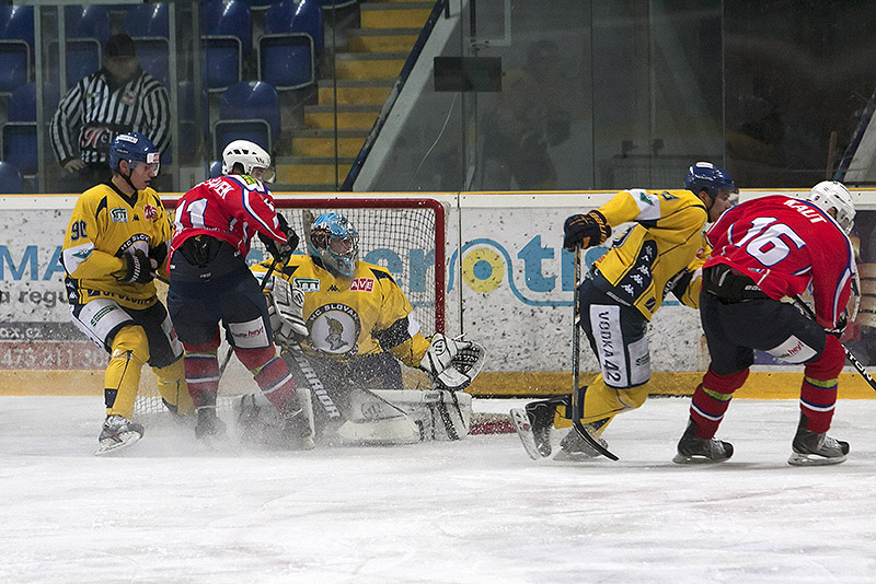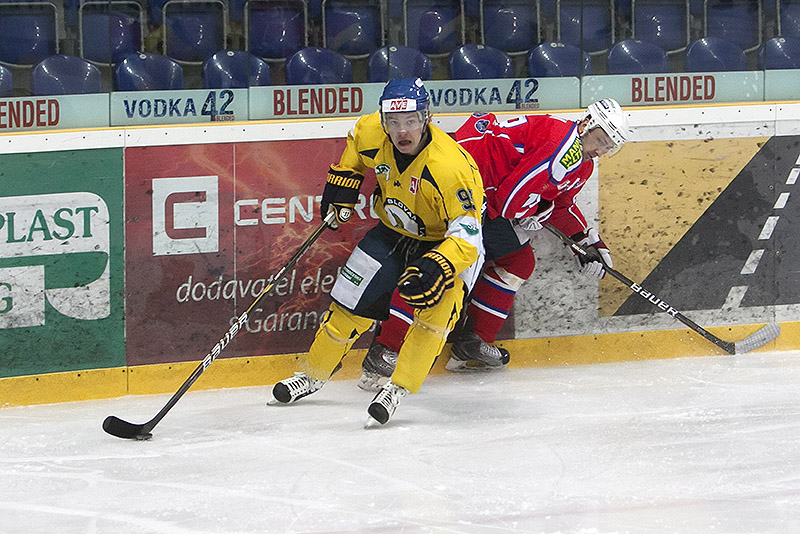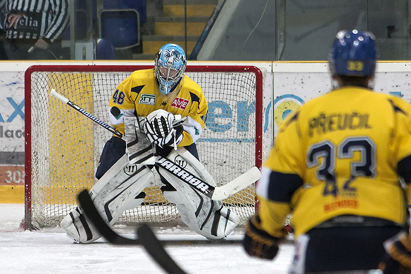 I přesto, že venku panují silné mrazy, dorazila do ústecké Zlatopramen Areny tisícovka příznivců hokeje. Začátek utkání začal v mírném tempu a oba soupeři se zpočátku spíše „oťukávali“. Skóre duelu Ústeckých Lvů proti Třebíči otevřel v sedmé minutě domácí Meidl, který tečoval Grinovu střelu. Modrožlutí se tak ujali vedení 1:0. V deváté minutě mohl zvýšit náskok Sýkora, který se ocitl před Čiliakem. Ten byl ale pozorný. Třebíčští mohli vyrovnat v přesilové hře, ale puk do Petráskovi klece nedopravili. Také šelmy z Ústí získaly po faulu Rangla početní výhodu. Ve 14. minutě propálili Lvi z boku Čiliaka. Branka ale nebyla uznána, protože žlutomodrý Přeučil stál v brankovišti. Další power-play získali Ústečané tři minuty před první sirénou, ale ani tentokrát ji nevyužili. Už to vypadalo, že úvodní část skončí jednobrankovým rozdílem, ale nestalo se tomu tak. Pouhých sedm vteřin před první sirénou našla střela Poživila dobře postaveného Roubíka a ten se nemýlil - 2:0. Po první třetině tak měli domácí dvoubrankový náskok.
