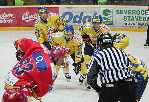 Branky a nahrávky: 20. Janků (Pazourek), 30. Klimt (Martinec), 54. Hořava (Čaloun) - 31. Sýkora (Linhart), 35. Ondřej (Tvrdík), 53. Pivko (Havíř), 65. Sýkora (rozhodující sam. nájezd). Rozhodčí: Šír - Špringl, Podrazil. Vyloučení: 10:8. Využití: 1:1. V oslabení: 1:0. Diváci: 3540. Střely na branku: 37:43. Průběh utkání: 2:0, 2:3, 3:3, 3:4.