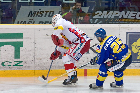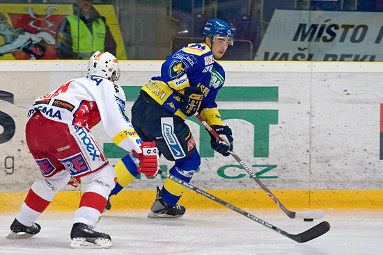 Úvod utkání se domácím příliš nepovedl, protože se již po 11 vteřinách museli bránit v oslabení. Ve 4. minutě výborně napadali kolem branky Slavie Mrázek a Novák, vybojovali kotouč a po následném závaru si domácí vykoledovali faul. V 7. minutě si do slibné šance najel Novák, ale přihrávka mu šla na dlouhou hokejku a netrefil. Brzy nato neproměnil svoji šanci ani Špirko. Dalším výborným forčekingem vybojovali domácí kotouč v 9. minutě a Slavii zatopila formace vedená Nedorostem. Slavia se pomalu rozjížděla a v 11. minutě poprvé nebezpečněji vyzkoušel Přikrylovu pozornost Žižka. Poté otěže zápasu uchopili hosté pevně do svých rukou a několikrát důrazně zahrozili před domácí svatyní. Domácí se ke slovu dostali opět až ve 14. minutě, ale Nedorostovu střelu zápěstím Furch chytil a z následného tlaku se neurodilo. Trest za neproměněné šance přišel v 17. minutě. Zápotočnému přeskočil ve středním pásmu puk hokejku, toho se zmocnil Růžička a vymetl horní růžek Přikrylovy branky - 0:1.