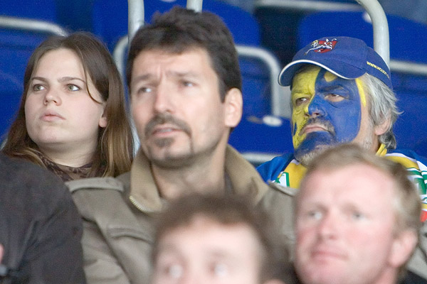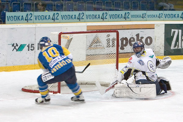 Poklidné první minuty utkání přerušil až ústecký Diviš ve svém druhém střídání, kdy si dokázal vybruslit před branku a zkusil, jestli nepropasíruje puk k bližší tyči. Jako by tak dopřál svému týmu impulz k útočné aktivitě. Hanzl z pravého křídla hledal přihrávkou najíždějícího Janků, ten se ale s pukem nepotkal. Důraz v ofenzivě přinesl domácím přesilovku. V ní připravili gólovou situaci Čurilla s Hovorkou, první jmenovaný si nabruslil do pásma a poslal střelu na branku, druhý dorážel těsně na brankové čáře, Jarina se ale nenechal přetlačit a udržel bezbrankový stav. Vzápětí ukázala i Kadaň, že se umí drát do útoku. Karel Ton se tak moc dožadoval přístupu před branku, až byl hákován. Přesto ještě zakončoval, a tak Francouz musel zasáhnout, stejně jako po přesilovkové ráně Balázse. Hosté předváděli důrazný silový hokej, proti čemuž stavěli Lvi rychlost a kombinaci. Úspěch ale přinesl první způsob. Přindišovu ránu od modré umístil za Francouzova záda Ton - 0:1. Ústečtí si to nechtěli nechat líbit. Pazourek si vyměnil puk s Kankem a výsledkem byla střela, která se odrazila od konstrukce branky. Situace na ledě se začala poněkud přiostřovat, Révay odešel na trestnou za napadení. Slovan výhodu nevyužil, a tak mohl po buly v útoku pálit Szakal. Francouz jeho rychlou střelu vykryl. Domácí se ještě v závěru snažili usadit před Jarinou, ale připravená obrana si s nimi vždy poradila. Navíc Kadaňští nikdy nezaváhali vrhnout se do nebezpečného protiútoku, jak v závěru ukázal Hájek.