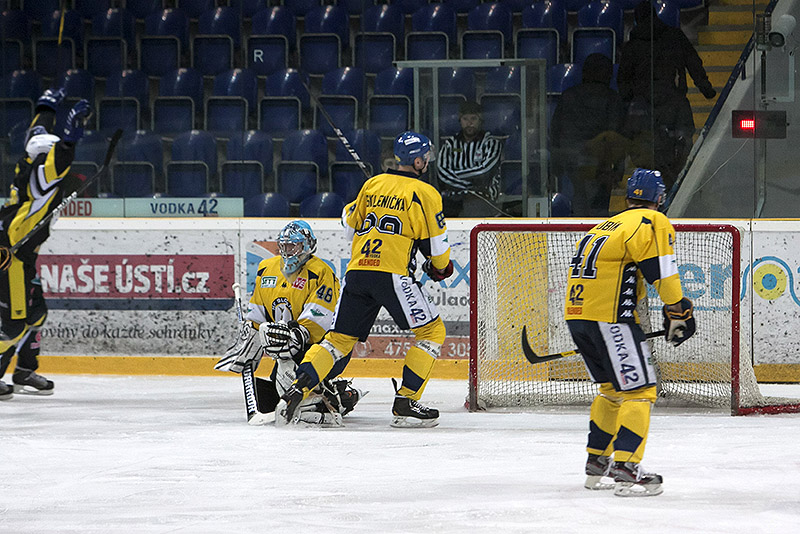 Ve třetí části si Ústečtí Lvi vyzkoušeli přesilovou hru pěti proti třem, kterou domácí po osmi vteřinách využili, když se ve 43. minutě Daniel Boháč dostal k odraženému puku a nadvakrát překonal hostujícího Hanuljaka. Ve 48. minutě však Kadaň odskočila opět na rozdíl dvou branek, když v přesilové hře napřáhl z mezikruží Martin Mazanec a svou střelu poslal přímo k tyči, kam už domácí brankář Petrásek nedosáhl. V 51. minutě už to bylo o tři branky. Nikým nehlídaný Roman Chlouba nedal střelou do protipohybu Petráskovi šanci. Konečné skóre uzavřel v 54. minutě domácí Lukáš Handlovský, který s nabídnutou příležitostí nezaváhal a střelou z první prostřelil Hanuljaka.