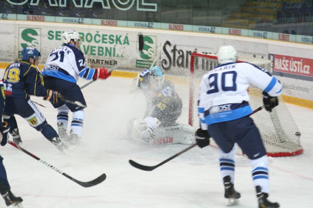 Po prvních pěti minutách třetí části Ústí vyrovnalo. Domácí v přesilové hře chvíli kombinovali v útočné třetině, až se nakonec ke střele dostal Jaroslav Roubík, který mosteckého Horáka z kruhu pro vhazování propálil.